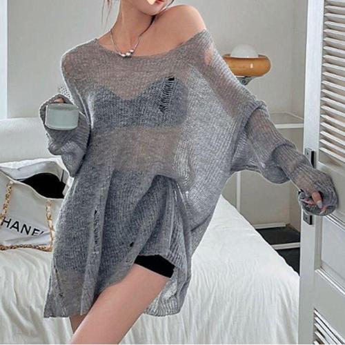 겨울 니트 루즈핏 브이 시스루 그물 셔츠 스웨터 여자 티 긴팔 WFKZLXH
