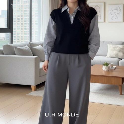 유아몽드 / 카라넥 긴팔 스트라이프 셔츠+니트 베스트 레이어드