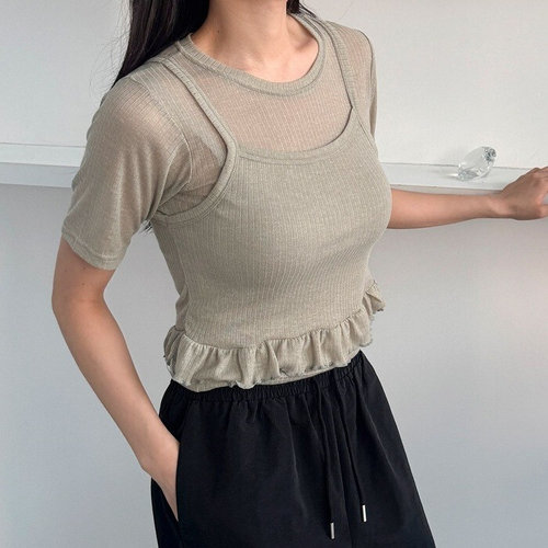 플러리싱 / 레이어드 세미크롭 프릴 나시 반팔티 세트 플러리싱