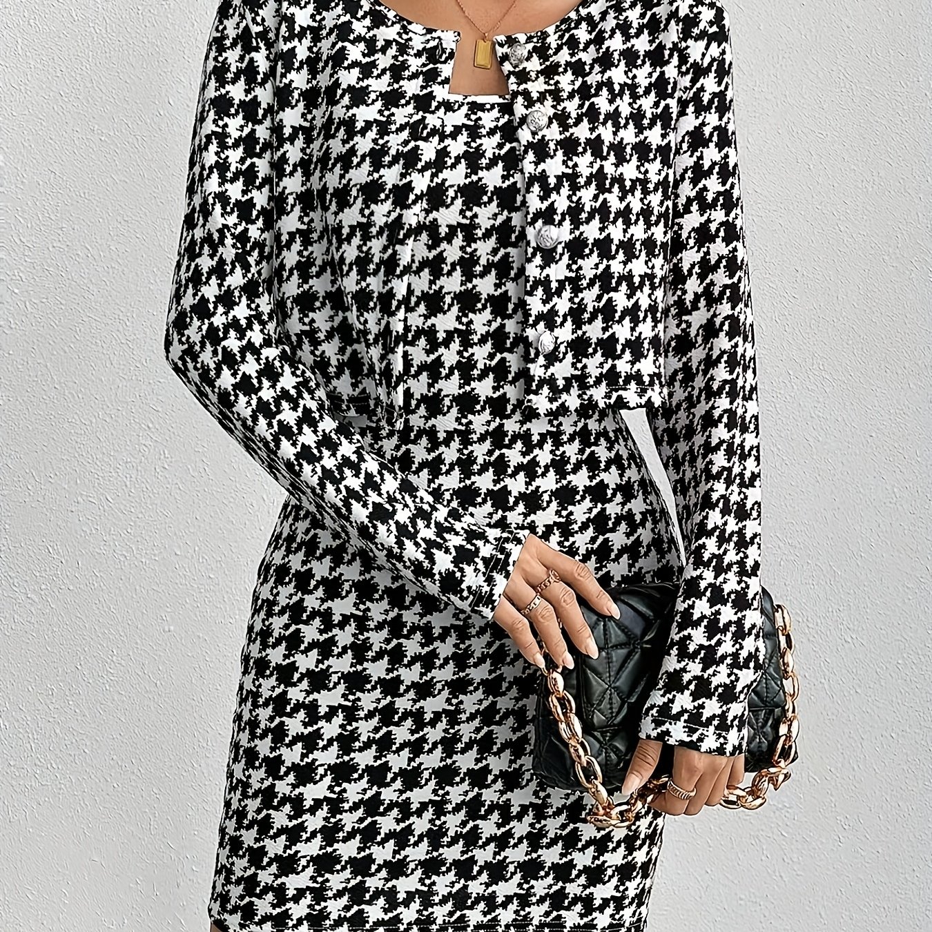 TEMU 여성 하운드투스 드레스 세트, 폴리에스터 니트, 기하학적 패턴, 라운드 넥, 중동 스타일, 봄/가을 패션, 여성 의상