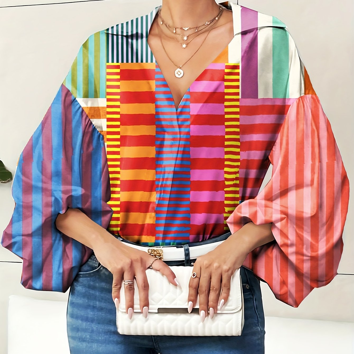 TEMU ランタンスリーブ 컬러풀 셔츠 | 여성 빈티지 기하학 프린트 블라우스, 하프 오픈 칼라, 긴소매, 플레어 밑단, 올 시즌, 시크한 주말 캐주얼