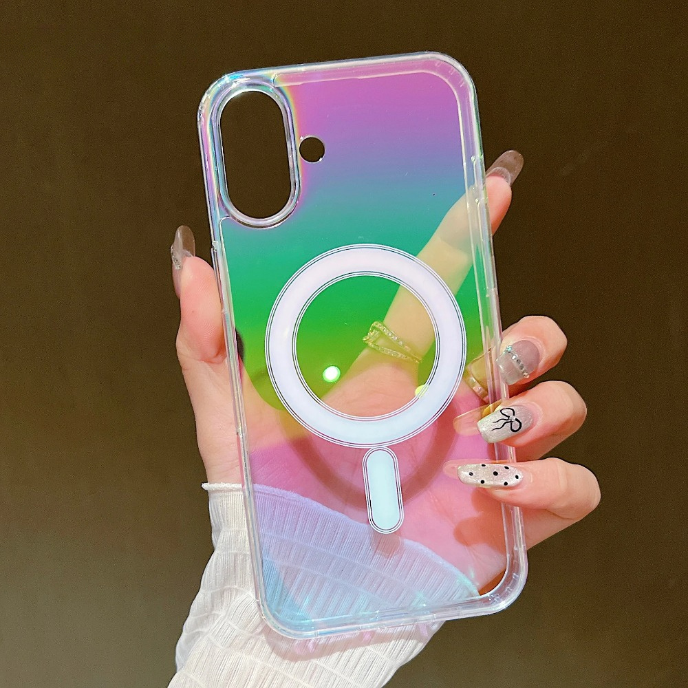 TEMU 투명 레이저 무지개 자석 커버 아이폰 모델 16, 15, 14, 13, 12, 11 Pro, X, XS, XR, 8, 7 Max Plus, SE 무선 충전 지원