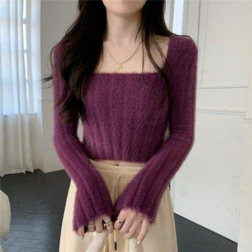 [에이치플러스몰]크롭 배꼽티 앙고라 긴팔 겨울 기장 4color 니트 여성