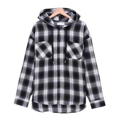 [끌레아]은창]루즈 후드 체크 스트링 남방 셔츠 아우터 상의 가을 셔츠 여성 블라우스 겨울 보온 사
