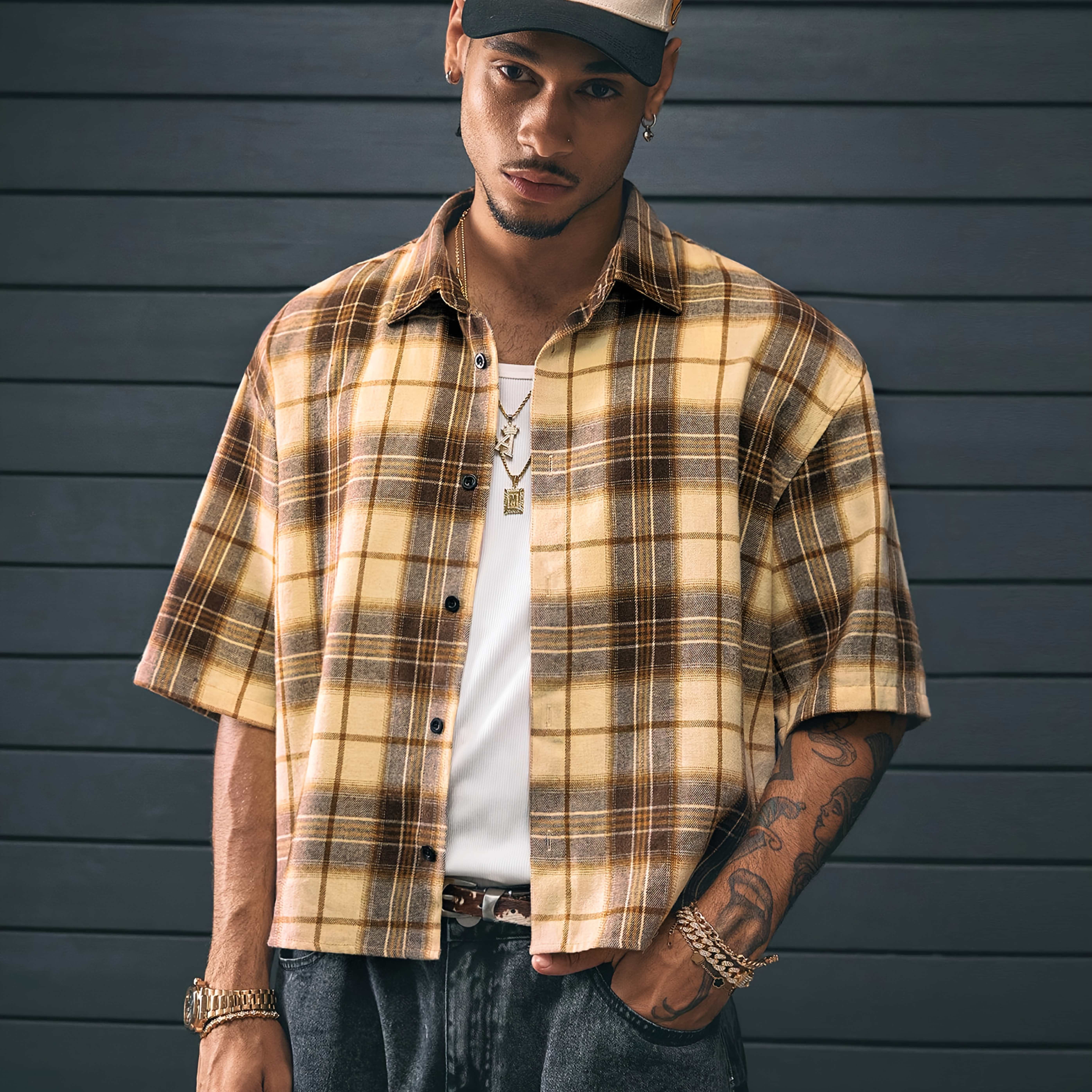 TEMU 남성용 대학 스타일 반팔 체크 셔츠 (봄, 여름, 가을용). 캠퍼스룩, 캐주얼 외출, 휴가, 데이트 및 일상복에 적합. 100% 소재, 세탁기 사용 가능 (드라이 클리닝 불가). WCY9283