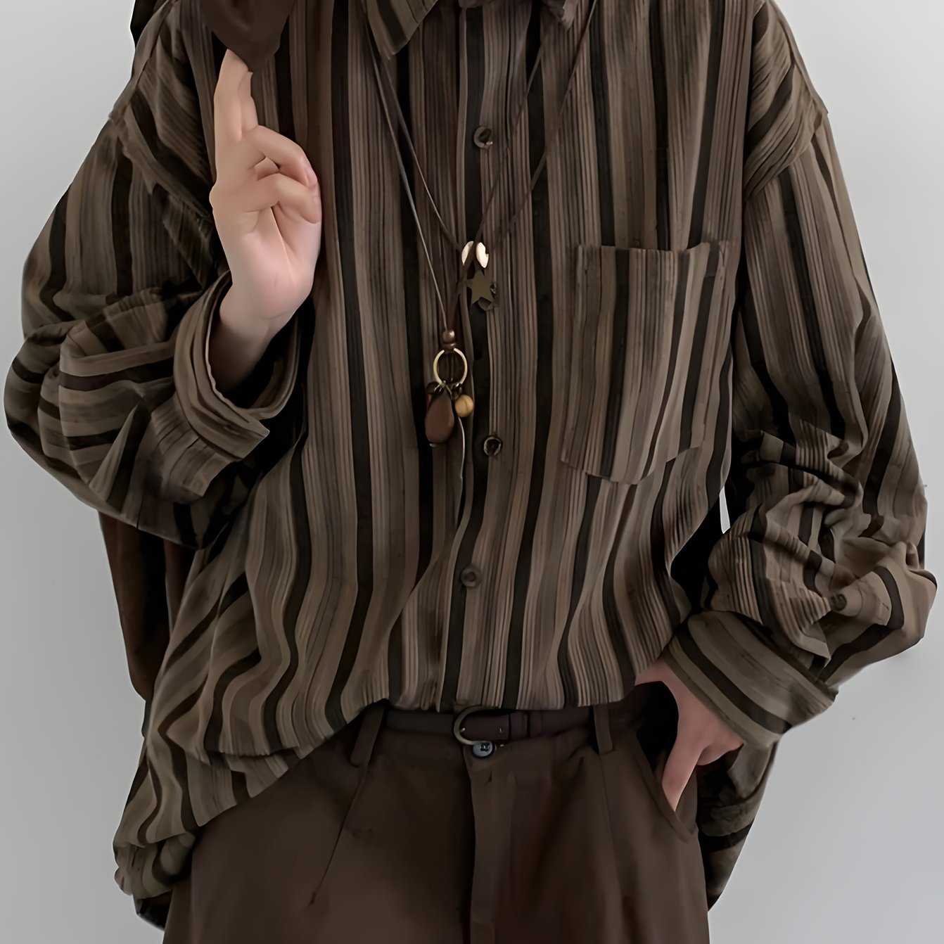 TEMU 남성용 빈티지 스타일 버튼업 셔츠 - 긴 소매, 캐주얼 라펠 칼라, 갈색 & 흰색 수직 줄무늬, 봄/가을에 완벽, 캐주얼 의상, 캐주얼 의상|빈티지 스타일 셔츠|버튼업 셔츠, 남성용 셔츠/반팔, 긴 소매 셔츠 남성용, 스타일리시한 남성용 셔츠, 흰색 셔츠 남성용|남자셔츠|반팔셔츠|반팔