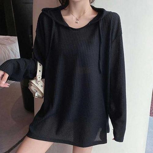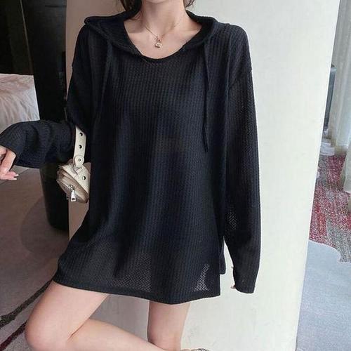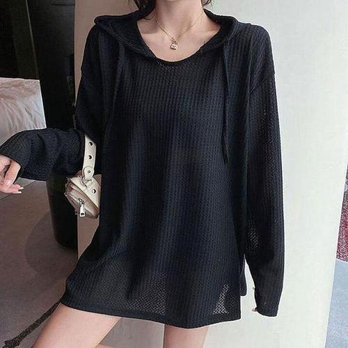 [셀러허브_여성트랜드패션]ONM 후드 긴팔 티셔츠 얇은 니트 시스루 루즈핏 데일
