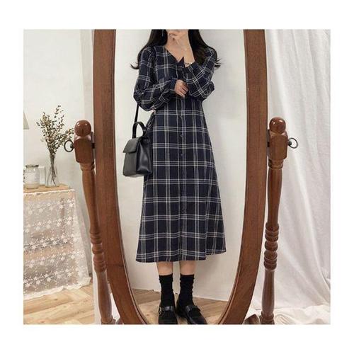 [에이치플러스몰]여성체크롱원피스 2컬러 1P 브이넥 얇은 여자 치마
