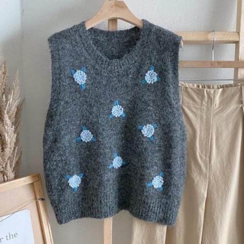 [옷자락]여성 양모 니트 베스트 꽃무늬 루즈핏