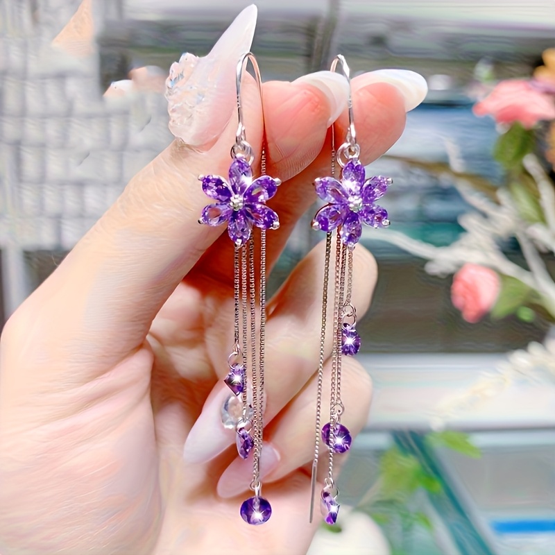 TEMU 우아하고 섹시한 럭셔리 패션 여성용 귀걸이, 반짝이는 보라색 합성 지르코니아와 꽃 인레이, 친구를 위한 이상적인 선물. 일상 출퇴근, 파티, 음악 축제, 휴가, 연회에 완벽, 연회용 귀걸이,플로럴 디자인, 이어링,패션 애호가
