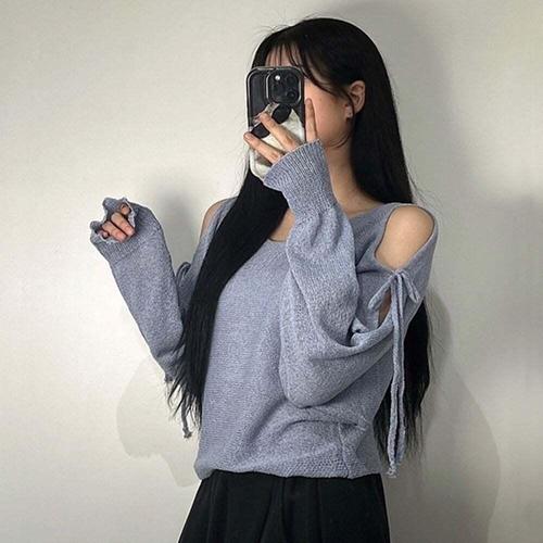 [셀럽하우스]여성 WMVP6444 시스루 어깨트임 리본 부클 여름 니트 티 3color