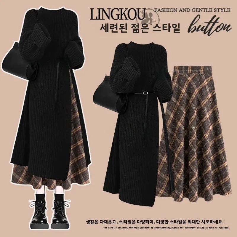 하이 웨이스트 체크 스커트와 니트 아우터웨어 투피스 세트 여성용 가을 겨울 패션 캐주얼 스타일 한국 슬림핏 세트