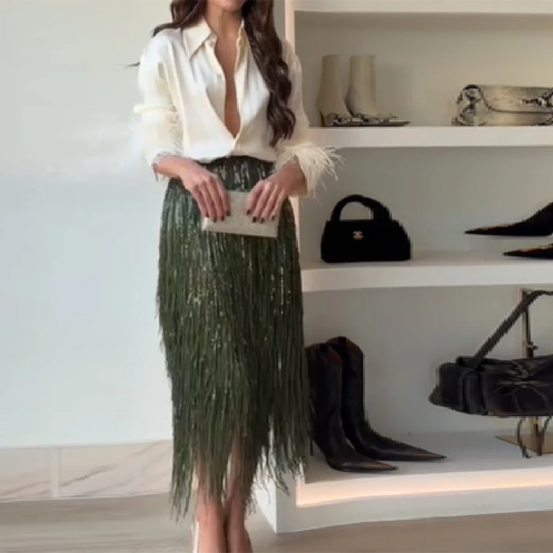패션 신상 그린 태슬 스커트 루즈핏 미디 기장 스트레이트 샤이니 장식 하이웨이스트 튜브 스커트 여성 파티 시선강탈 의상
