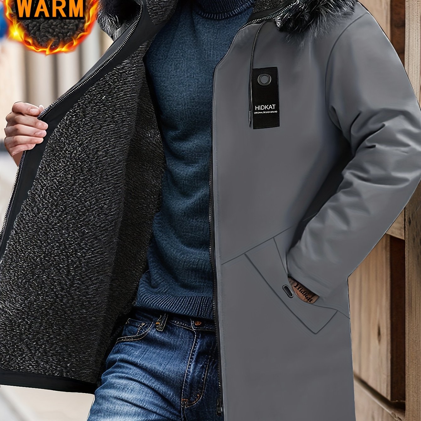 TEMU 겨울 남성용 루즈핏 후드 재킷 | 패셔너블한 기모 안감 두꺼운 미디 길이 코트, 지퍼 포함, 야외 레저 및 캠핑에 적합 | 브랜드: HIDKAT