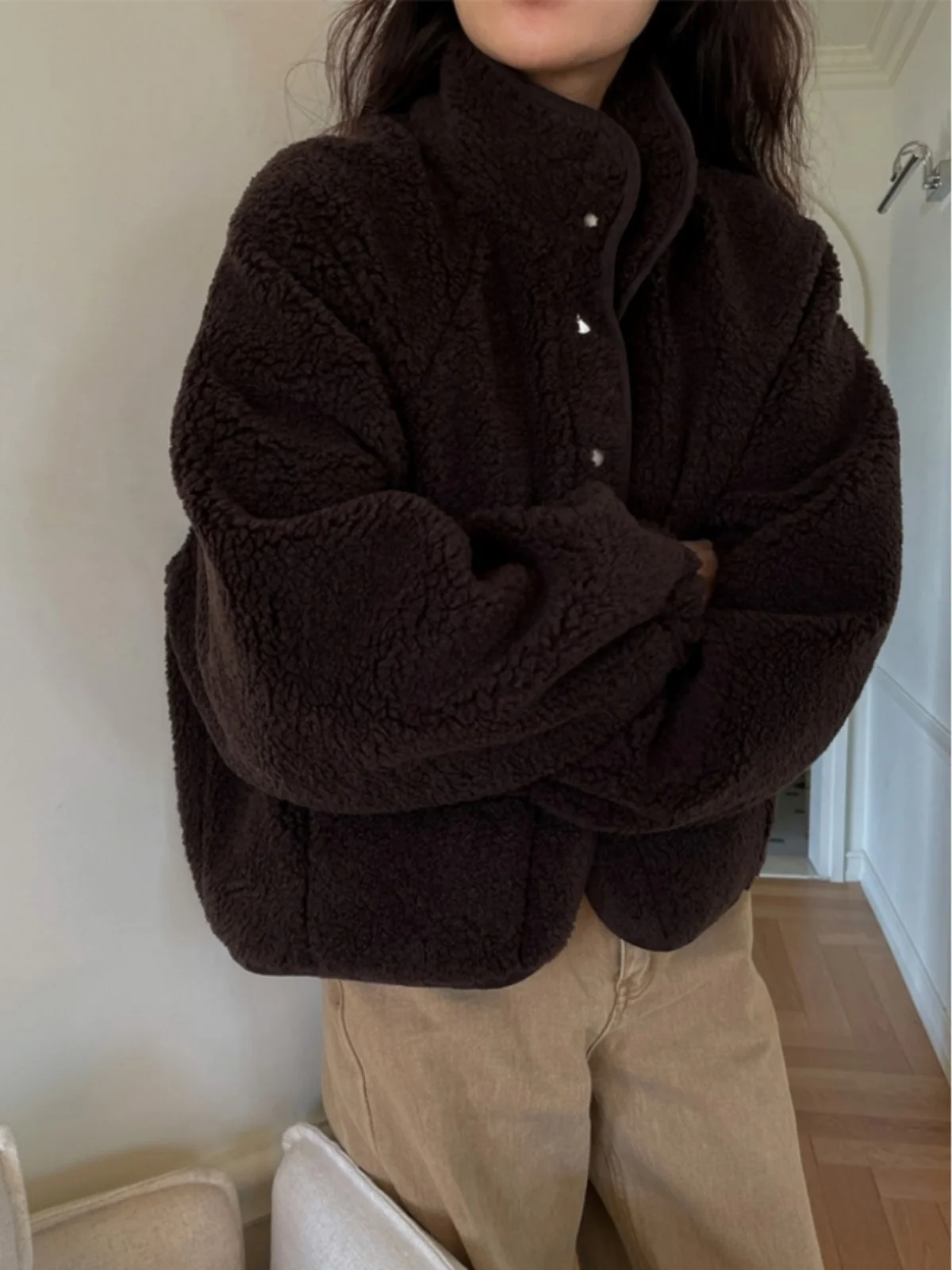 양털 자켓 여성 캐주얼 루즈핏 스탠드 칼라 버튼업 보온성 좋은 큰 사이즈 코트 빈티지 스타일 2025년 봄 출퇴근 트렌드