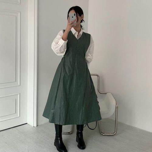 [다잇템]여자 FW 옆버클 V넥 레더 에이라인 롱원피스