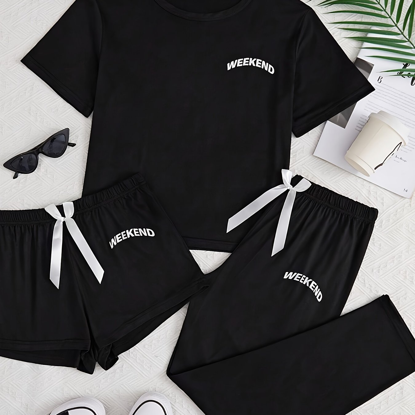 TEMU 여성용 3피스 세트, 스타일 반팔 잠옷 "WEEKEND" 프린트, 편안한 캐주얼 라운지웨어, 레터 프린트 세트, 보우 타이 티셔츠와 바지 포함, 올 시즌 착용, 캐주얼 라운지웨어 | 스타일 | 편안한 잠옷, 여성정, 여성정장, 가을여성옷 세트, 상하세트 여성, 플리츠 상하세트, 여자정장세트