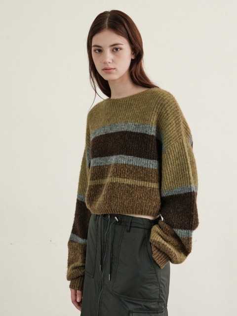 [힐리먼트] 여성 스트라이프 크롭 니트 (카키)