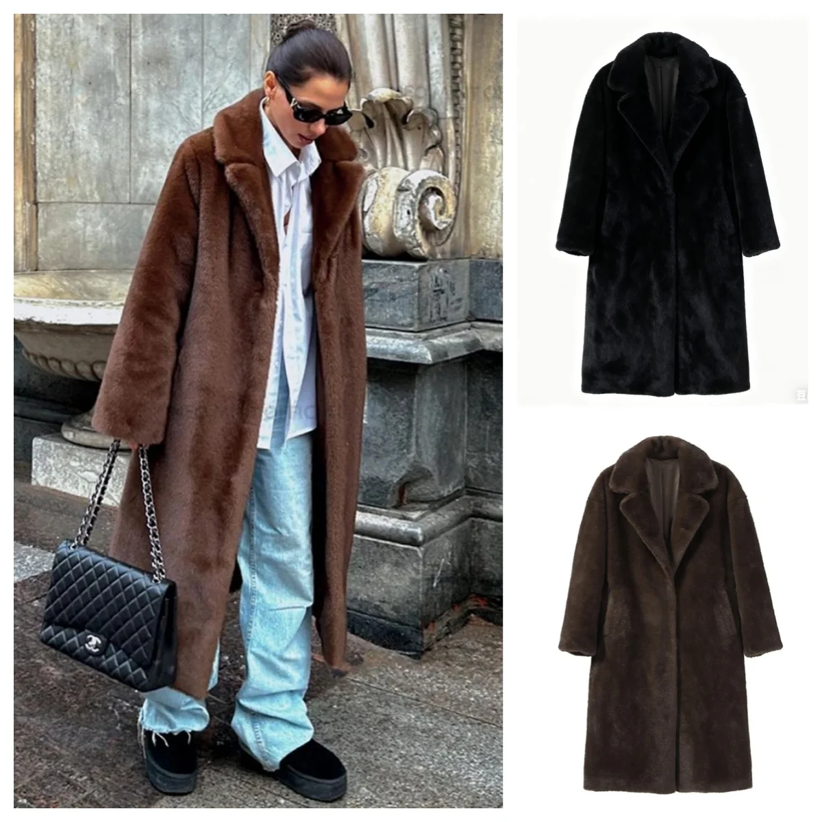 브라운 중간 길이 모피 코트 여성용 라펠 히든 버튼 루즈 엘레강트 아우터웨어 2025 패션 오피스 레이디 출퇴근용 오버코트 신상품