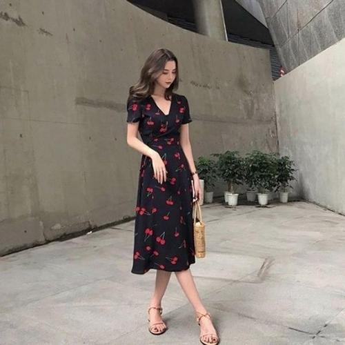 [모노무드]모노무드 여성 체리패턴 롱원피스 허리끈 랩스커트 여름 원피스
