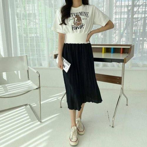 여성 트위드 여름 주름 롱니트 밴딩 반팔 롱 WFKPDQ3
