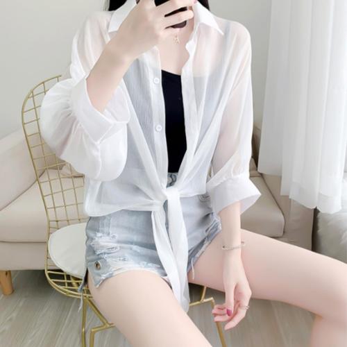 여름 선 스크린 셔츠 우아한 관점 얇은 시폰 블라우스 한국 하라주쿠 루즈 탑 캐주얼 여성 카디건을 통해 볼 수 있습니다.