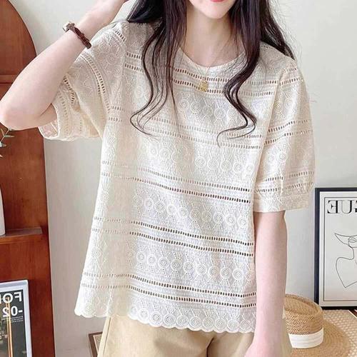 [모노무드]모노무드 여성 자수 펀칭 반팔 블라우스 1P 라운드넥 여름 셔츠
