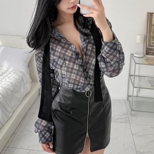 [다잇템][다잇템] 여자 비침 넥리본 여성스러운 썸머 격자 SS 블라우스_19381444_588872