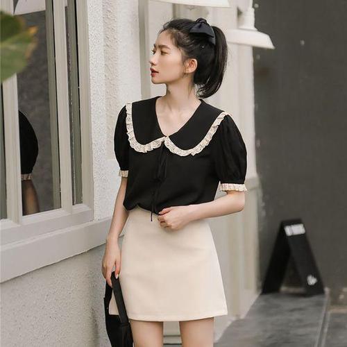 애비뉴투지 엄마옷 블랙엔 화이트 배색 여름 반팔 쉬폰 숏 블라우스 B08530