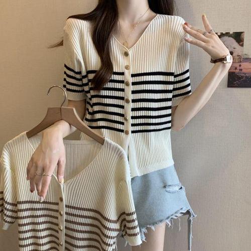 [무드수]브이넥 찰랑 스트라이프 여리 반팔 가디건
