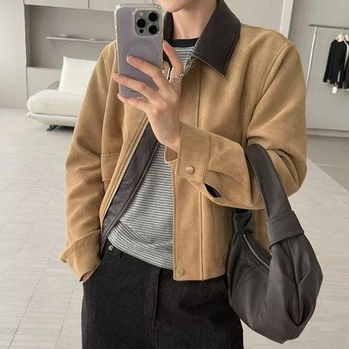 [삐까삐까]여성 세미 크롭 스웨이드 자켓 루즈핏 레더배색 카라 집업 가을 겨울 고퀄 아우터