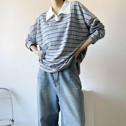 [신상오픈런]여성 배색 카라 넥 스트라이프 루즈핏 가을 긴팔 티셔츠