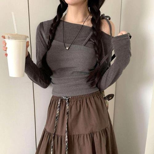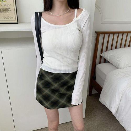 [다잇템]여자 세로골지 어깨끈 언발 롱슬리브 니트