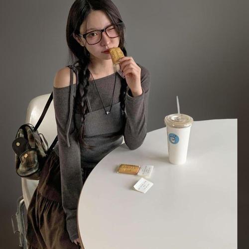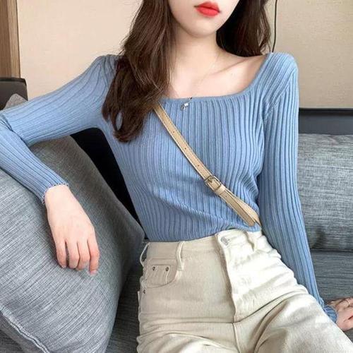 [다잇템]여자 어깨 롱슬리브 스퀘어넥 슬림핏 골지 니트