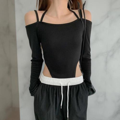 [신상오픈런]여성용 슬림핏 스판 오프숄더 긴팔 바디수트 티셔츠
