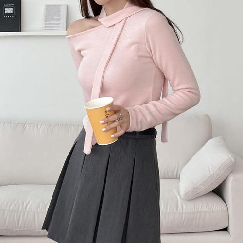 [옷자락] 여자 오프숄더 연분홍 봄티 사선 크롭 넥타이 티셔츠