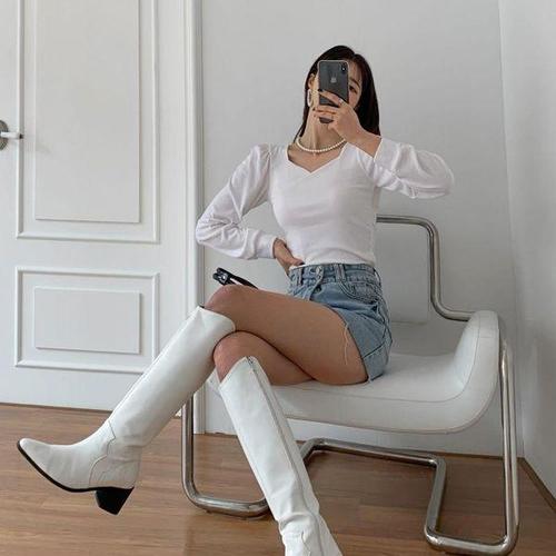 여자 봄티 슬림 셔링긴팔 하트네크 티셔츠