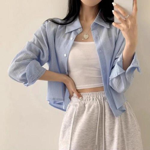 여성 봄 여름 긴팔 셔츠 캐주얼 세로 줄무늬 루즈핏 셔츠 여자 외출용 상의