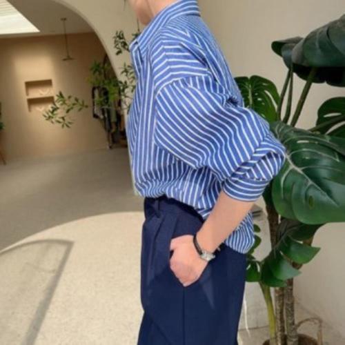 레티고 청순 단가라 스트라이프 오버핏 긴팔 카라 셔츠