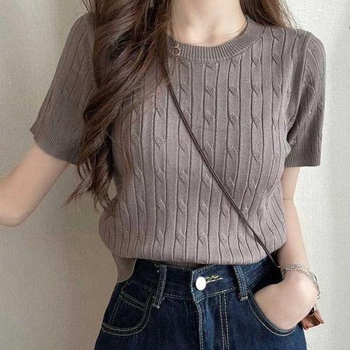 [셀러허브_여성트랜드패션]ONM 여성 라운드넥 꽈배기 크롭 반팔 니트티 데일리룩