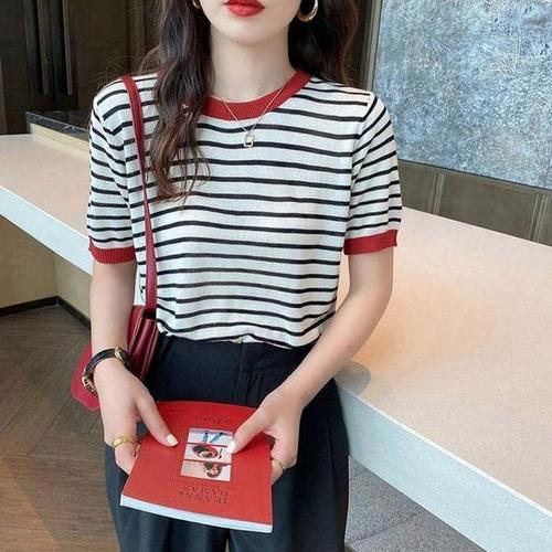 [셀러허브_여성트랜드패션]ONM 4컬러 배색 스트라이프 라운드 여름 반팔 니트티