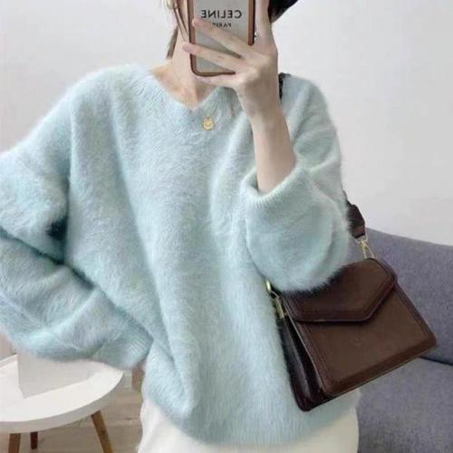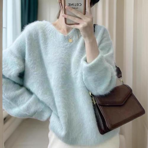 여자 겨울 브이넥 아이보리 블루 밍크 퍼 니트