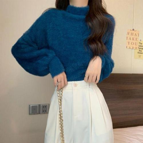 [옷자락] 여자 겨울 크림 블루 블랙 폴라 밍크 퍼 크롭 니트