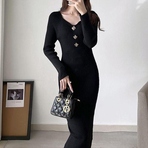 여성 스퀘어넥 니트 롱원피스 슬림핏 하객룩 드레스 WFKPXZG