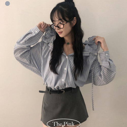 더핑크 / 히몽 오버핏 스트라이프 버튼 프릴 후드 셔츠