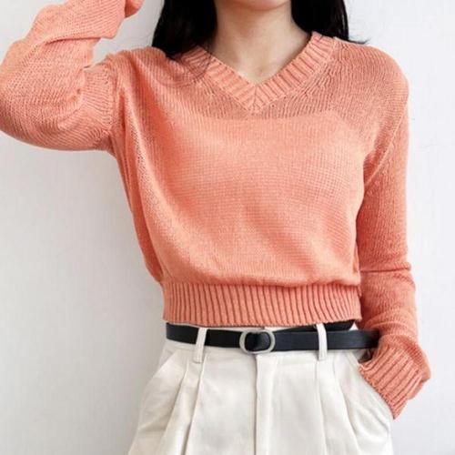 [에이치플러스몰]여성 여름 데일리 크롭 브이넥 긴팔 니트 티셔츠