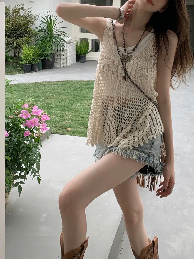 2024 신상 여성용 홀로우 아웃 셔츠 베스트 탑 세트 여름 여행복 세트 홀로우 디자인 패셔너블 앙상블