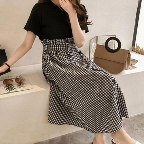 [엄지척]여자 검정 반팔티 허리밴딩 체크 스커트 투피스 세트_19953297_667501