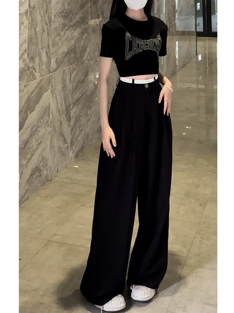 미국 스타일 하이웨이스트 와이드 레그 수트 팬츠 여성 여름 신상 슬림 스트레이트 루즈 드레이핑 컬러 블록 플로어 길이 캐주얼 바지