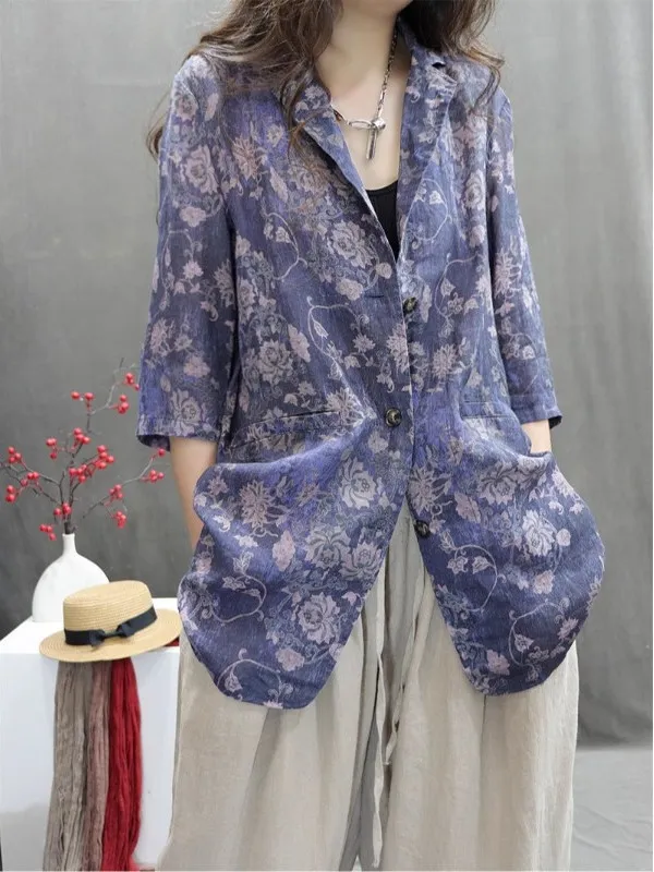 레트로 프린트 코튼 린넨 수트 재킷 여성 여름 루즈 캐주얼 3/4 소매 린넨 스몰 웨스턴 스타일 오픈 가디건 탑